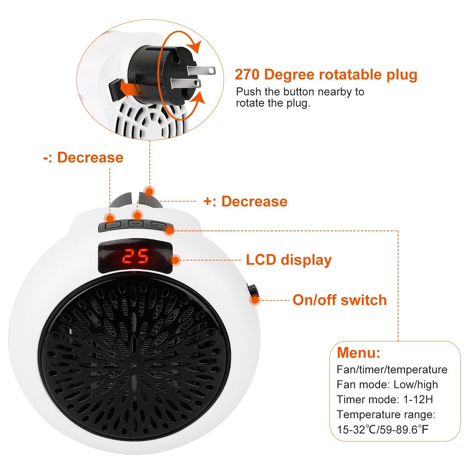 *Portable*:It plugs directly into the wall outlet without any cable involved. Besides,the 270 degree rotatable plug can easily fit the wall outlet in narrow space. This heater can be held with just one hand. Therefore you can take it to any room at home.