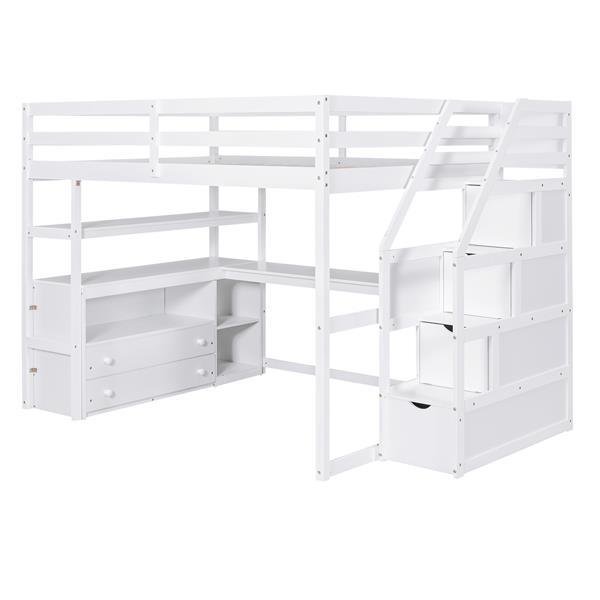 Full Size Loft Bed with Desk and Shelves, Two Built-in Drawers, Storage Staircase, WhiteThis full size loft bed with desk, shelves and drawers is a simple and stylish bed frame that coordinates well with a variety of decor styles, allowing you to elevate and enhance your space with ease. Staircase can ensure that you can reach the upper bunk safely, and can also provide storage space for your items. Made of solid solid pine wood with strong support slats, this bed is durable and sure to accompany you for many years to come. What's more, it's a desk, shelf and two large storage drawers all in one.DescriptionMaterialPine Wood+MDFSizeFullColorWhiteNumbers of Package3Spring boxNo needAssembly RequiredYesOriginVietnamDimensionsOverall Product Dimension95.1''L*57''W*65''HPackage DimensionPlease refer to the SpecificationBed Dimension76''x 55.5''Total height65''Overall Product Weight295.5lbLoft Bed Weight Capability350lbRecommend Mattress thickness6''[Multifunctionl Design]This loft bed includes a desk, shelves storage staircase and two large storage drawers in one.Not only provides you with a place to work or study, but also provides a large storage space.[Maximized Space] The full loft bed can save plenty of room for you to place other furniture in your bedroom. This bed provide ample storage for your everyday items.[Sturdy Frame] The bed structure is crafted from high-quality solid pine wood, solid pine legs and a strong, durable frame so that the bed is sturdy and durable.[Safety Guaranteed] Solid wood slats blend naturally into the already sturdy frame to give added ground-up support that provides stability.The loft bed features guard rails for added safety, and is accessible via the sturdy, slanted staircase. Enjoy many long years of relaxation and family fun, secure in this meticulously designed wood loft bed.[No Box Spring Needed] The wood slats support the mattresses not to slide and increase the service life.