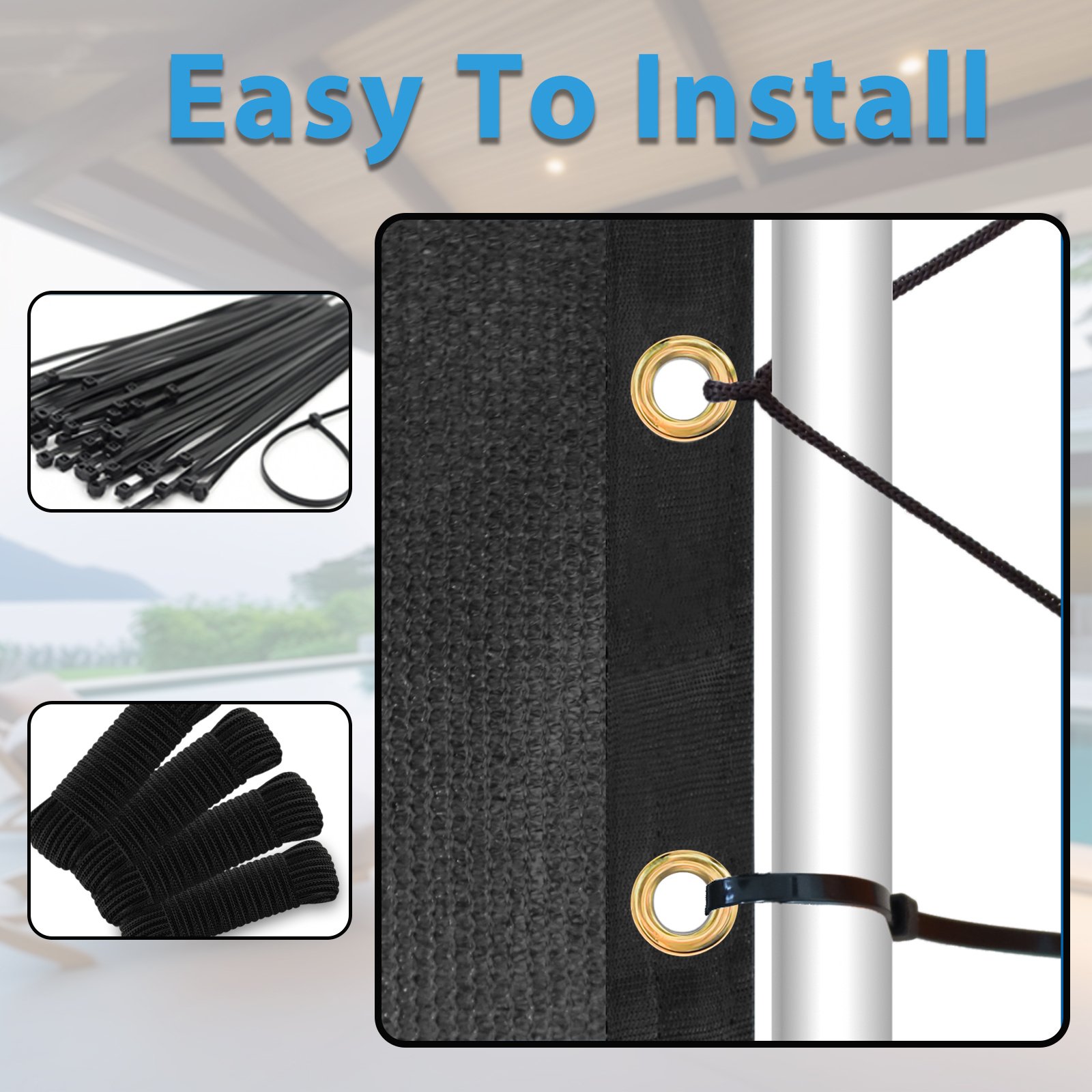 3.Effortless Installation: Equipped with sturdy Grommets GN08, our shade fabric is a breeze to install. The grommets are strategically placed along the edges, making it easy to secure the fabric to various structures, such as pergolas, patios, fences, and more. This ensures a secure and stable fit, preventing the fabric from sagging or flapping in the wind.