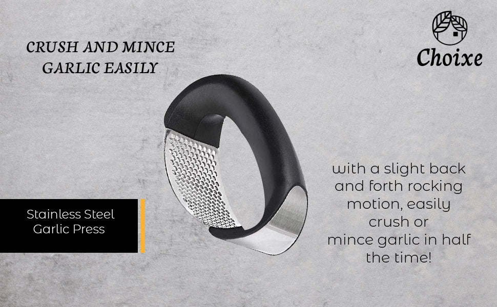 NEW INNOVATIVE ROCKING GARLIC PRESS. This new garlic press with an arc shape and comfortable handle design make squeezing a breeze; even for those with weaker grip or small hands.