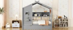 Wooden Twin Size House Bed With Trundle, Modern Design for Kids with Storage Shlef, GrayTransforming any bedroom into a whimsical haven, this bed with its charming roof doubles as an imaginative play area perfect for studying, watching TV, or unleashing their creativity. Equipped with three shelves at the back, it effortlessly combines functionality and style, offering ample storage for decor, clocks, books, and more. Resembling a cozy tiny house, its pitched roof design adds a touch of childhood nostalgia while seamlessly blending with any decor. The contemporary style and neutral finish ensure versatility, allowing this enchanting design to stand out in any space. With its sturdy pine frame and roof feature, rest assured your little ones will have a secure and peaceful slumber.